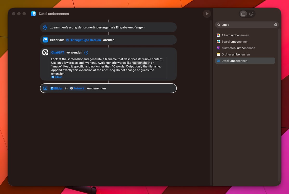 Der Kurzbefehl selbst bekommt bestenfalls einen sprechenden Namen wie „Screenshot-Renamer“ und wird gespeichert. Ab dann läuft alles vollautomatisch: Screenshot machen, Datei landet im Ordner, die Automation springt an, wertet das Bild aus, vergibt einen sinnvollen Namen und speichert zurück. Kein manueller Eingriff, kein Shortcut-Klick. Noch einmal ohne viel Erklärerei in einzelnen Schritten: