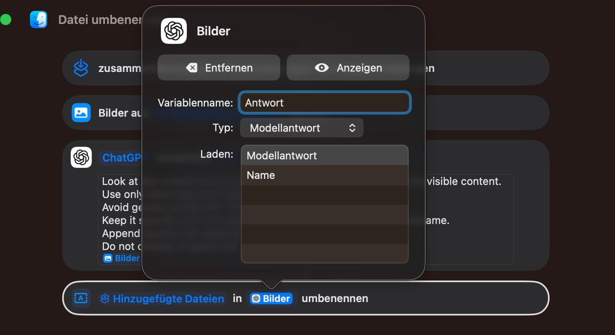 Der Kern ist dann eine KI-Aktion im Kurzbefehl. Unter macOS stehen dafür Apple Intelligence oder über entsprechende Integrationen auch Dienste wie ChatGPT bereit. Die Aktion „Modell verwenden“ bekommt ein klares Briefing: Der Screenshot soll kurz beschrieben werden, daraus wird ein Dateiname mit Kleinbuchstaben und Bindestrichen gebaut, ohne Füllwörter wie „screenshot“ oder „image“, maximal zehn Wörter.