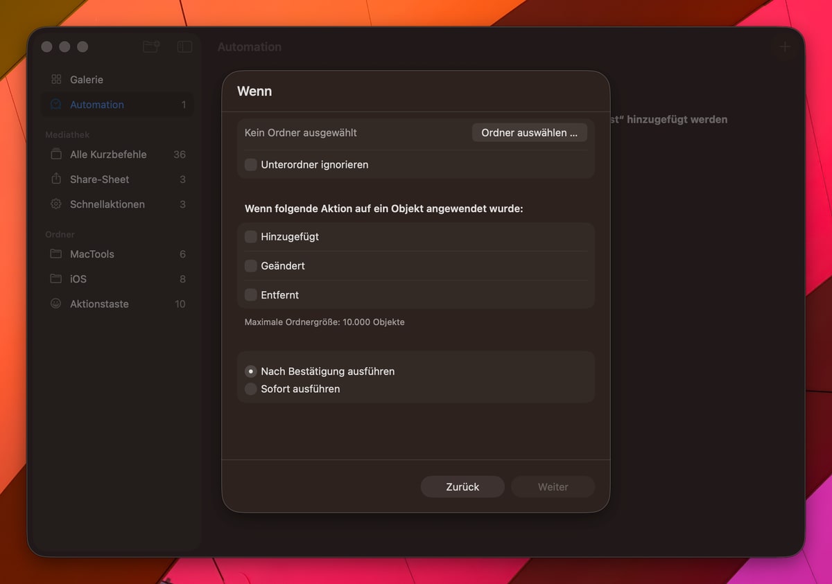 Ihr wollt das ausprobieren? In der Kurzbefehle-App geht es über den Reiter „Automation“. Dort wird eine neue Ordner-Automation eingerichtet, die reagiert, sobald in diesem Screenshot-Ordner eine Datei landet. Der Trigger ist schnell gesetzt: „Wenn Dateien zu meinem Ordner Dokumente hinzugefügt werden“, Modus „Wenn beliebige Objekte hinzugefügt werden“, dazu „Sofort ausführen“. Da wählt ihr auch den Screenshot-Ordner aus. Wer gern sieht, was passiert, kann die Benachrichtigung für jeden Lauf aktivieren, das ist aber optional:
