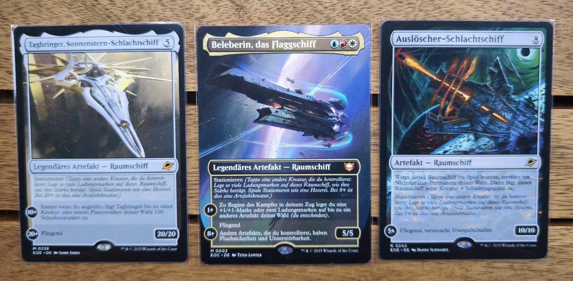 Neu sind in „Am Rande der Ewigkeiten“ die Raumschiffe, welche es in verschiedenen Farben gibt. Gemeinsam ist ihnen, dass sie als Artefakte ins Spiel kommen. Fast alle können aber mittelfristig zu mächtigen Artefaktkreaturen werden. Dafür gibt es die neue Fähigkeit „Stationieren“. Letztere wird wie eine Hexerei im eigenen Zug gespielt. Ihr tappt dafür eine oder nacheinander mehrere eurer ungetappten Kreaturen und legt dann so viele Stationierungsmarken auf das jeweilige Raumschiff, wie ihre Stärke beträgt. Je nach Raumschiff wird es dann ab einer bestimmten Anzahl an Marken zu einer Artefaktkreatur und kann beim Kämpfen mitmischen.