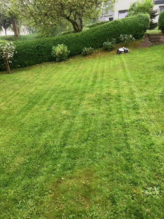 Die Schnittqualität ist durchweg überzeugend. Egal, ob auf kurzem, regelmäßig gepflegtem Rasen oder auf testweise stehen gelassenen Flächen mit bis zu 20 cm hohem Gras, der Luba Mini liefert ein gleichmäßiges, sauberes Schnittbild. Die sechs rotierenden Klingen arbeiten sauber und sorgen dafür, dass auch längere Halme zuverlässig gekürzt werden, ohne dass der Mäher ins Stocken gerät oder das Gras umlegt. Besonders positiv fiel auf, dass auch bei niedrigen Schnitthöhen keine Löcher entstehen und die Ränder sauber geschnitten werden. Wer Wert auf Streifenmuster legt, kann in der App gezielt das Mähmuster anpassen – etwa auf Zickzack oder Schachbrett. Das Ergebnis ist ein gepflegter, optisch ansprechender Rasen.