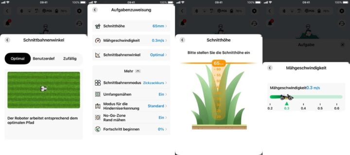 Wer mehrere Zonen oder Kanäle anlegen will (z. B. für Vorgarten und Hinterhof), kann das direkt in der App erledigen. Die Navigation zwischen den Bereichen klappt reibungslos, auch schmale Wege sind kein Problem. Die App bietet die üblichen Optionen für Schnitthöhe, Mähmuster (Zickzack, Schachbrett, Zufällig), Geschwindigkeit, Kantenmodus, No-Go-Zonen etc. Auch Rasen-Tattoos sind auf Wunsch möglich.