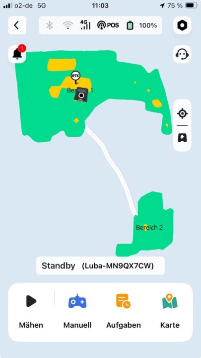 Die Einrichtung läuft unkompliziert. Nachdem ihr den Aufbau vorgenommen habt und der Mäher in der Ladestation steht, müsst ihr diesen nur noch Bluetooth koppeln, WLAN einrichten, Firmware-Update machen und dann geht es los. Das Mapping des Rasens klappt entweder manuell oder vollautomatisch per Kamera. Gerade das Auto-Mapping hat im Test beeindruckend präzise funktioniert. Für das manuelle Mapping fahrt ihr den Roboter gewissermaßen wie ein ferngesteuertes Auto um die Abgrenzungen eures Grundstücks.