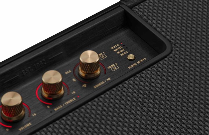 Marshalls rustikales Flair will man im Heimkino etwa durch die gerändelten Metallreglern, einfangen, die an die Gitarrenverstärker der Marke erinnern sollen. Da soll auch die gewickelte Lederverkleidung ansetzen. Das analoge Bedienfeld mit haptischen Reglern erlaubt es euch z. B. Bass und Höhen lassen direkt anzupassen. Wer das etwas altmodisch findet, nutzt die offizielle Begleit-App. Die Marshall Heston 120 offeriert euch auch verschiedene Sound-Modi, darunter Music, Movie, Night und Voice. In der Begleit-App gibt es aber auch einen Equalizer zur Personalisierung.