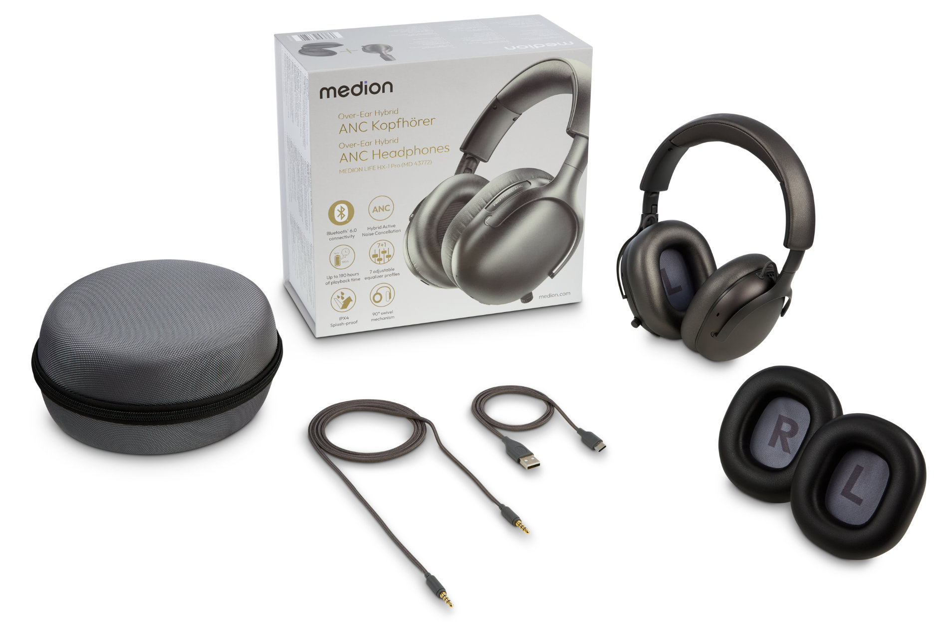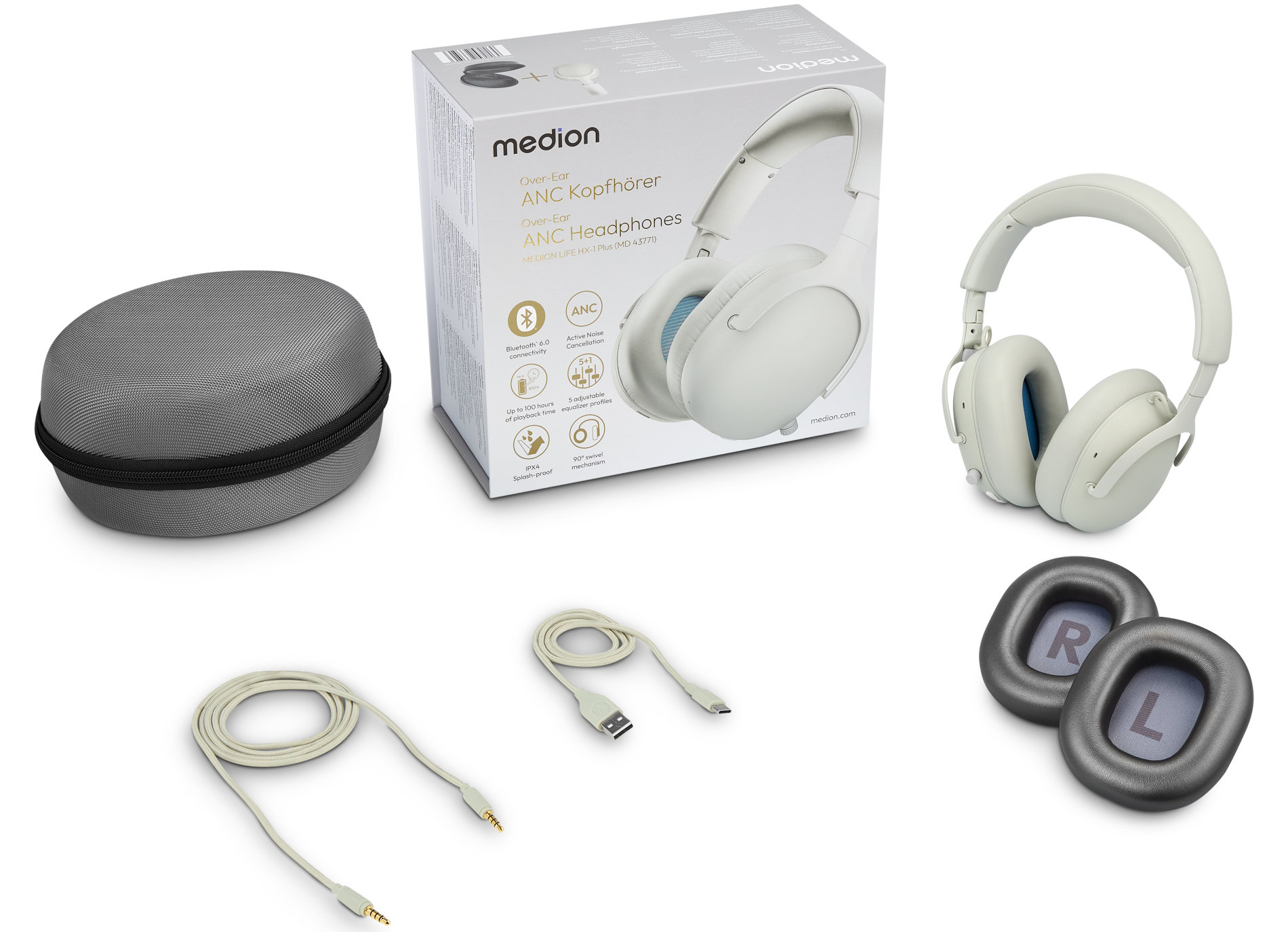 - Lieferumfang: HX-1 Plus Kopfhörer, Aufbewahrungsetui, 2x austauschbarer Ohrpolster, USB-C-Ladekabel, AUX-Kabel