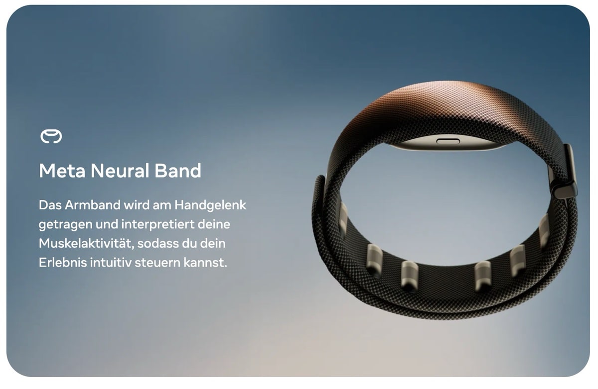 Neu ist die Steuerung über das mitgelieferte Meta Neural Band. Das Armband erkennt kleinste Muskelbewegungen am Handgelenk und setzt sie in Befehle um. Klingt kompliziert, funktioniert aber angeblich intuitiv, ein leichtes Wischen mit dem Daumen reicht schon für die Navigation.