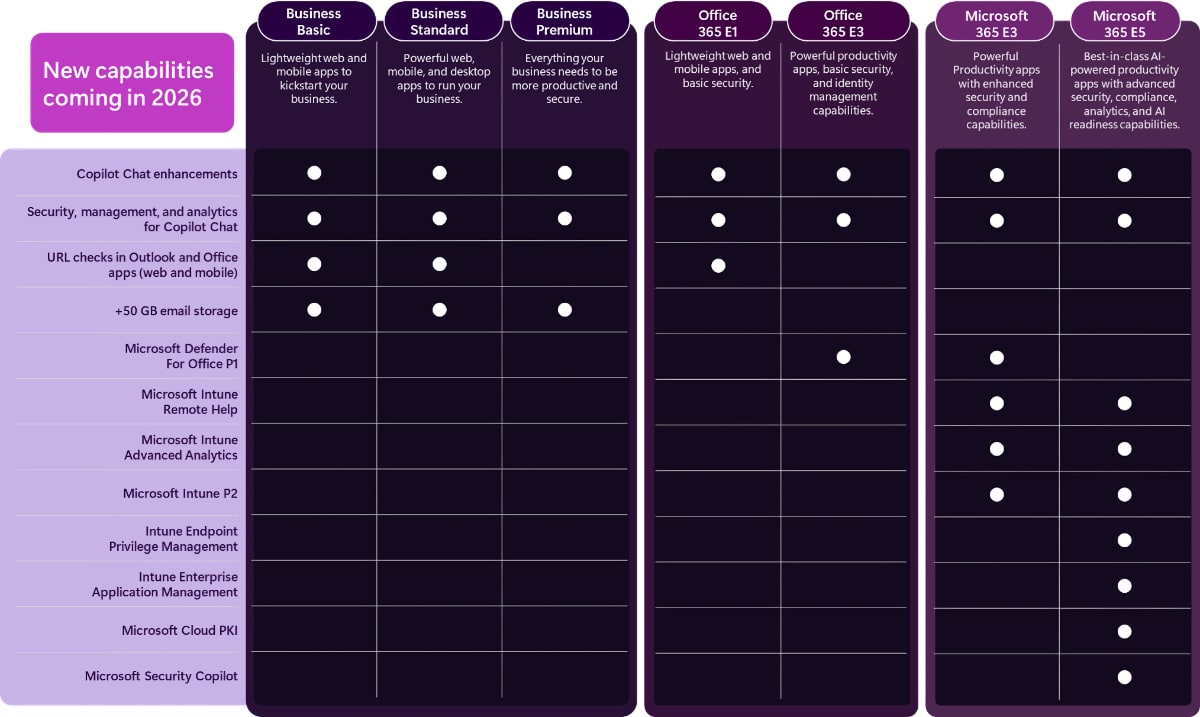 Microsoft kündigt Änderungen für seine Microsoft-365-Pakete an, die sowohl den Funktionsumfang als auch die Preisgestaltung betreffen. Der Konzern möchte Unternehmen frühzeitig informieren, denn die neuen Preise greifen erst ab dem 1. Juli 2026. Damit bleibt Administratoren und Einkäufern genügend Zeit, die Budgets entsprechend anzupassen. Inhaltlich liegt der Fokus auf mehr Sicherheit und KI-Integration.