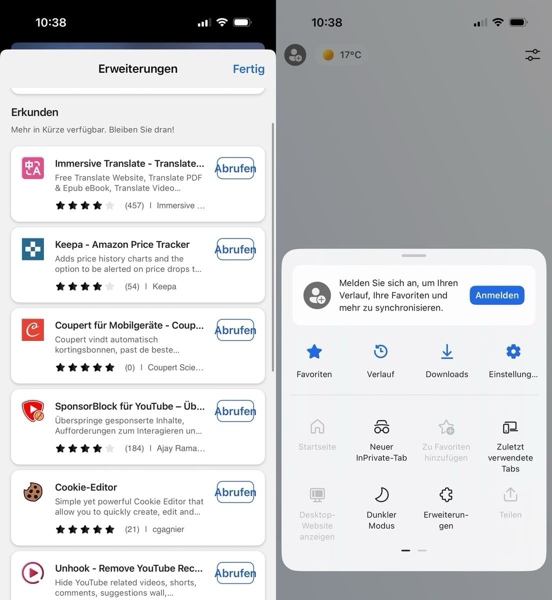 Im Einstellungsmenü findet sich jetzt ein neuer Bereich für Erweiterungen. Zum Start stehen bereits einige bekannte Add-ons zur Verfügung. Dazu gehören der Übersetzungsdienst Immersive Translate, der Amazon-Preistracker Keepa und oder auch der Lesezeichen-Dienst Raindrop. Die Installation erfolgt mit einem Fingertipp direkt aus dem Erweiterungsfenster.