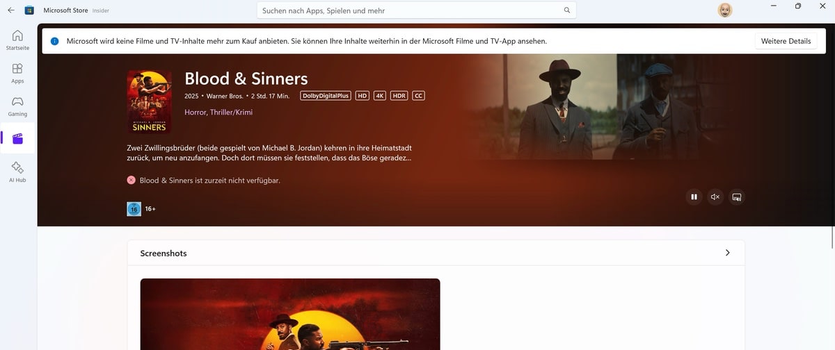Microsoft stellt den Verkauf von Filmen und TV-Serien in seinen digitalen Stores ein. Der Schritt betrifft den Microsoft Store unter Windows, die Webseite Microsoft.com sowie den Xbox Store. Nutzer können ihre bereits erworbenen Inhalte weiterhin über die Movies & TV App auf Windows-Geräten und Xbox-Konsolen abrufen. Bereits gekaufte oder heruntergeladene Filme und Serien bleiben verfügbar und können wie gewohnt abgespielt werden. Eine Übertragung der Lizenzen auf andere Streaming-Dienste ist allerdings nicht möglich. Microsoft bietet auch keine Rückerstattung für bereits getätigte Käufe an.