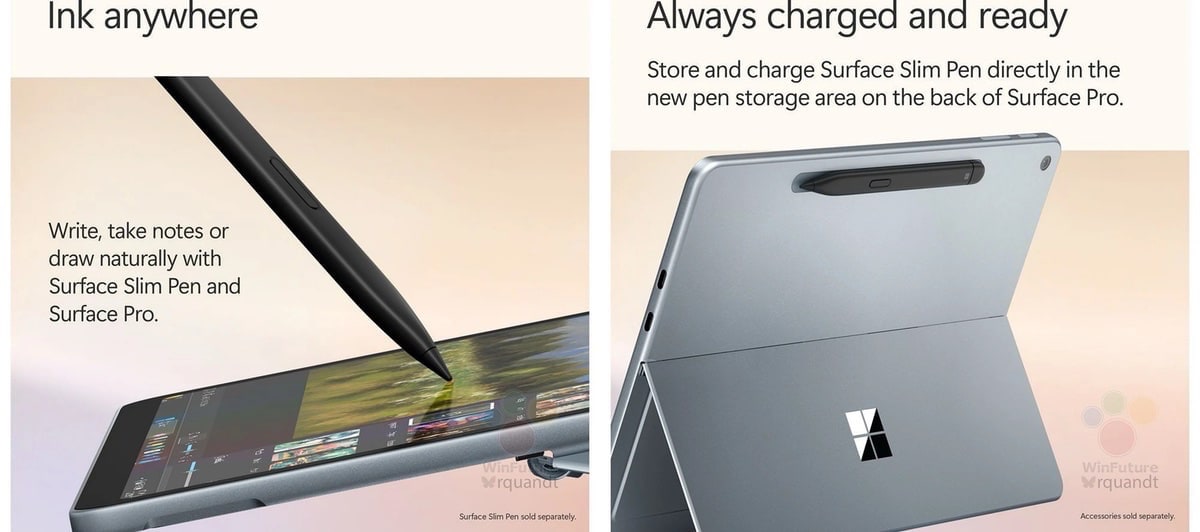 Das Display soll mit 120 Hz Bildwiederholrate punkten, wobei noch unklar ist, ob Microsoft auf LCD- oder OLED-Technologie setzt. Die Unterstützung für Surface Pen und Surface Slim Pen ist gegeben, wobei letzterer magnetisch an der Rückseite des Tablets haftet. Die Konnektivität umfasst zwei USB 3.2-Ports mit USB-C-Steckern.