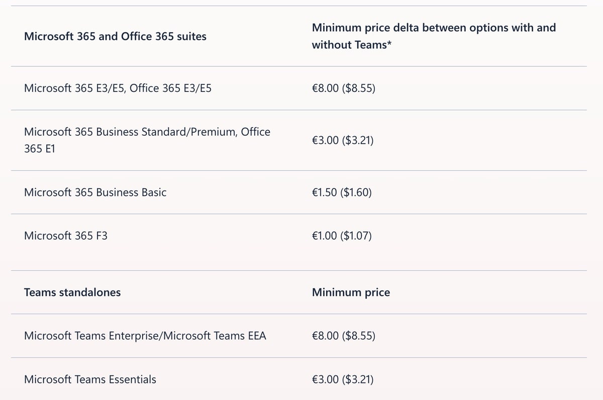 Microsoft hat sich mit der EU-Kommission auf Änderungen bei Microsoft Teams geeinigt. Die Redmonder werden ab November 2025 ihre Produktpalette umstrukturieren und neue Preismodelle einführen. Dabei geht es vor allem um die Entkopplung von Teams aus den Microsoft 365 und Office 365 Paketen. Kunden können künftig wieder zwischen Paketen mit und ohne Teams wählen. Die Preisdifferenz zwischen den Varianten ist dabei genau festgelegt: Bei den Enterprise-Versionen E3 und E5 beträgt sie 8 Euro, bei Business Standard/Premium und Office 365 E1 sind es 3 Euro, bei Business Basic 1,50 Euro und bei der F3-Version 1 Euro.