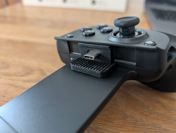 Das Design folgt dem bekannten Kishi-Prinzip: Der Controller lässt sich auseinanderziehen und umschließt dann das Smartphone von beiden Seiten. Durch den USB-C-Anschluss wird eine direkte, latenzfreie Verbindung hergestellt – ein klarer Vorteil gegenüber Bluetooth-Controllern. Die Halterung ist flexibel genug, um mit verschiedenen Smartphone-Größen kompatibel zu sein, gleichzeitig aber stabil genug, um einen sicheren Halt zu gewährleisten. Was mich etwas stört, ist das etwas hakelige Entfernen des Smartphones, wenn man man fertig ist mit dem Zocken. Ihr zieht den Controller dafür auseinander und müsst das Handy dann vom Anschluss abziehen. Problem dabei: Der Controller zieht sich auch schnell mal wieder zusammen und klemmt das Smartphone dann schnell schräg am Anschluss ein. Muss man gut aufpassen und sein Gerät da nicht einfach möglichst flott von abziehen.