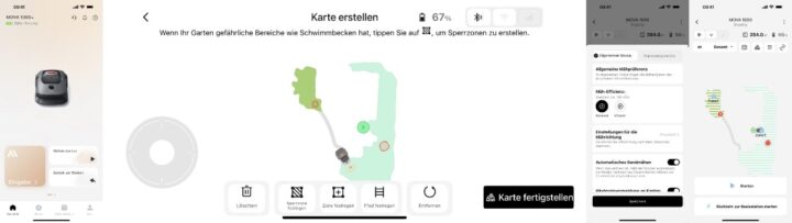 Die App selbst bietet dabei noch mehr Einstellungsmöglichkeiten – von Zeitplänen über Mähmuster bis hin zu Nachtmodi für den Schutz von Tieren. Man merkt jedoch, dass gerade bei der App ein wenig mehr Arbeit notwendig ist. Gelegentlich stimmt die Skalierung der Elemente nicht, es gibt leichte Übersetzungsfehler und die Push-Benachrichtigungen verwirren stellenweise.