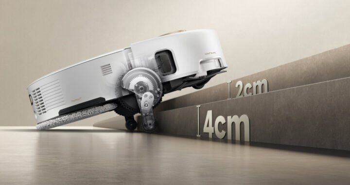 Für die Navigation kombiniert man einen ausfahrbaren Laser-Turm (LiDAR) mit Kameras. Eingefahren lässt der Sensor die Höhe des Saug- und Wischroboters auf 89,5 Millimeter schrumpfen. Wie bei den Modellen von Dreame, so ist zudem auch hier eine Sonderfunktion vorhanden, welche es dem Mova V50 Ultra Complete erlaubt, Schwellen von bis zu 6 cm Höhe zu überwinden. StepMaster nennt Mova seine Alternative. Auch hier schafft der Roboter die insgesamt 6 cm aber nur bei zwei Stufen als Kombination. Für ein einzelnes Hindernis sind es maximal 4,2 cm Höhe, die er überwindet.