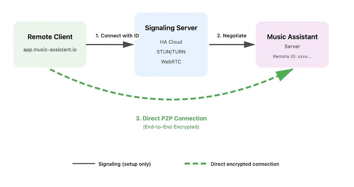 Durch die neue Nutzeranmeldung wird auch Remote-Streaming möglich. Über eine Web-App lässt sich die heimische Musiksammlung von unterwegs abrufen. Das System nutzt dabei die WebRTC-Funktionen der Home Assistant Cloud zur Audioübertragung. Ein kostenpflichtiges Abo ist dafür nicht zwingend nötig, Nabu Casa stellt die Infrastruktur bereit. Die Verbindung ist Ende-zu-Ende verschlüsselt.