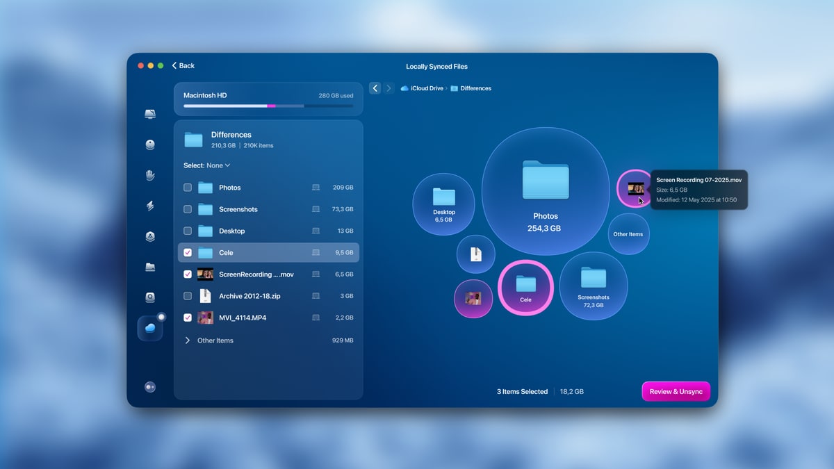 Cloud Cleanup bietet zwei zentrale Funktionen: Mit „Remove“ können überflüssige Dateien direkt aus der Cloud entfernt werden. „Unsync“ trennt die Verbindung zu Cloud-Dateien und löscht deren lokale Kopien, um Speicherplatz auf dem Mac freizugeben. Das Tool zeigt dabei in einer Liste alte, ungenutzte Dateien an und visualisiert große Dateien und Ordner in einer Größenkarte.