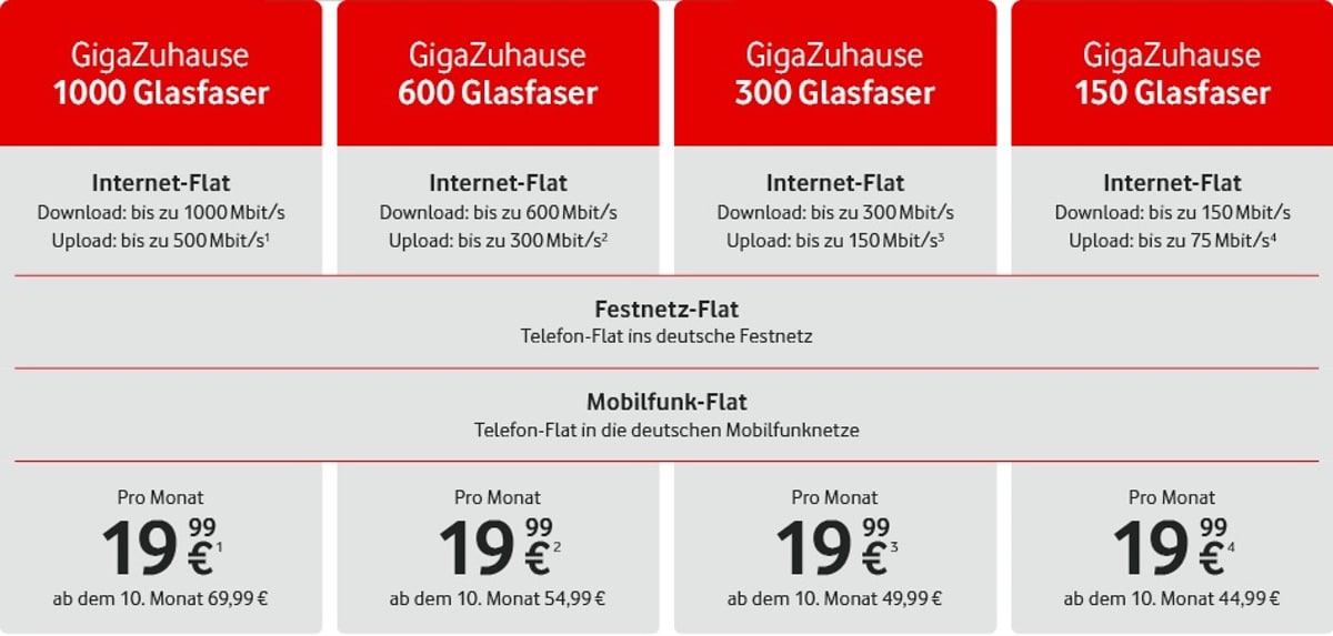 Vodafone legt bei seinen Glasfaser-Tarifen nach. Ab dem 26. Oktober gibts nicht nur mehr Geschwindigkeit in allen Tarifen, sondern auch günstigere Preise beim Top-Angebot. Die Einstiegsvariante GigaZuhause 150 Glasfaser bringt jetzt 150 statt 100 MBit/s ins Haus, der Upload liegt bei 75 MBit/s. Kostenpunkt: 44,99 Euro monatlich. Beim GigaZuhause 300 Glasfaser gehts mit 300 MBit/s (statt bisher 250) weiter, der Upload packt 150 MBit/s. Der Tarif schlägt mit 49,99 Euro zu Buche.