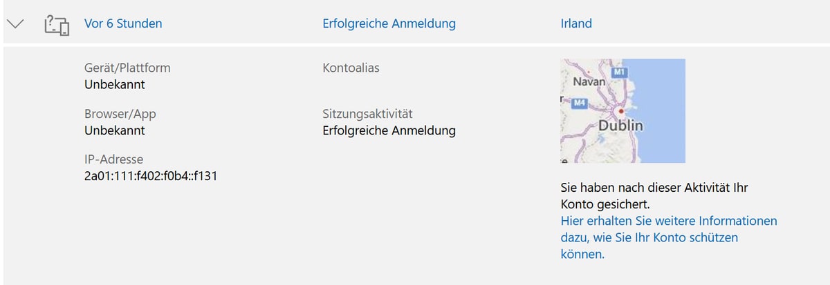 Weder hat man Warnungen oder Benachrichtigungen von Microsoft erhalten, noch gab es keine 2FA-Anforderung. Die Anmeldung kam von der IP 2a01:111:f402:f0b4::f131 aus Irland und die gehört zu einem Microsoft-Rechenzentrum. Wie bei vielen Betroffenen wurde auch hier das Passwort geändert, um sicherzugehen.