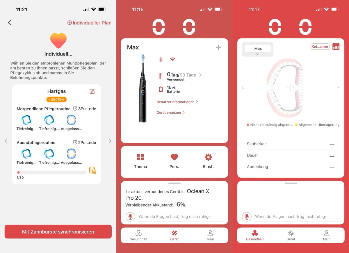 Die Zahnbürste bietet vier Putzmodi: Schnellreinigung, Zahnfleisch-Schonend, Aufhellen und Tiefenreinigung. Diese unterscheiden sich in Intensität und Dauer. Über die „Oclean Care“-App lassen sich zusätzliche Putzpläne erstellen und mit der Bürste synchronisieren. Die App selbst hat kürzlich erst ein Update erhalten, was sie etwas zugänglicher macht.