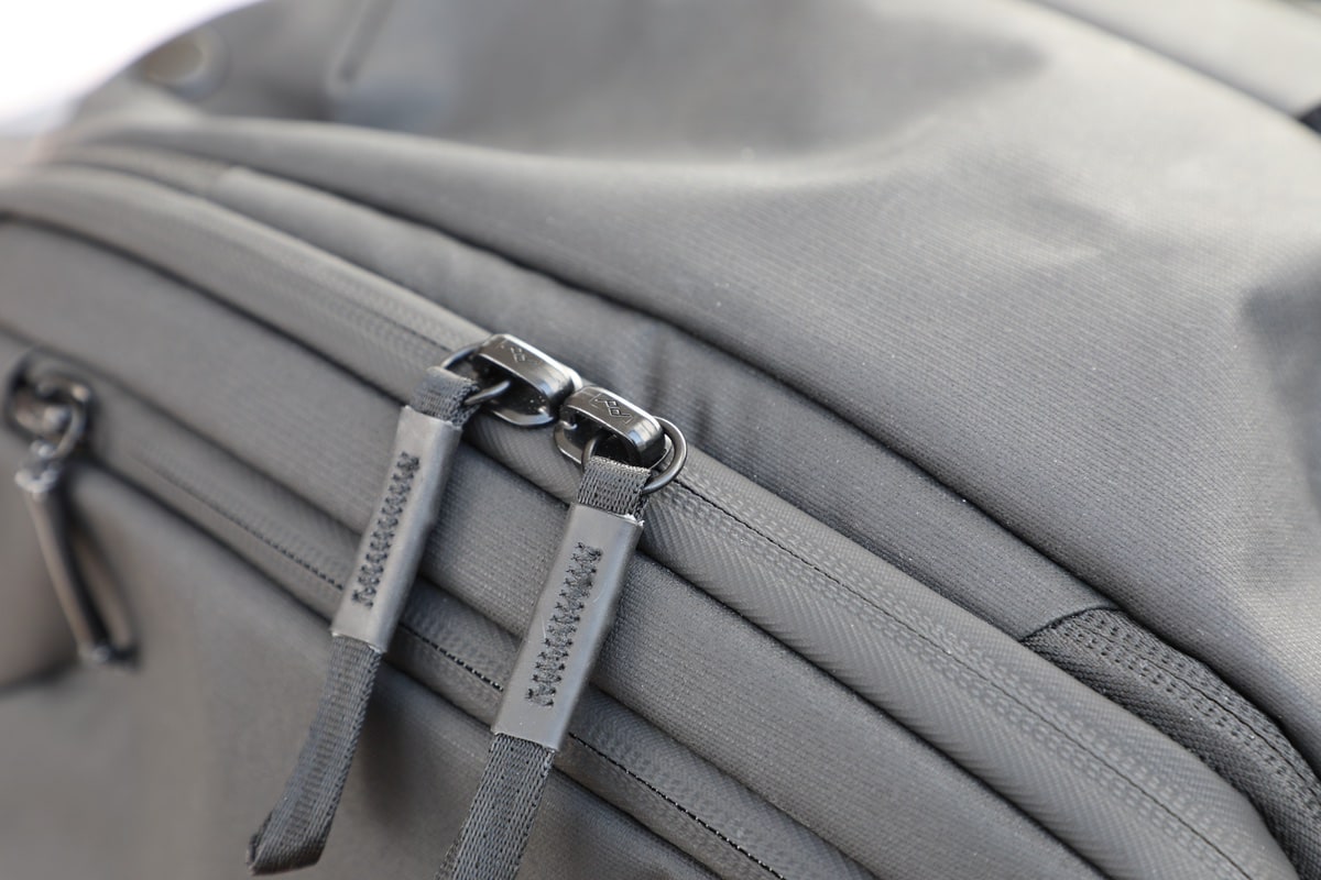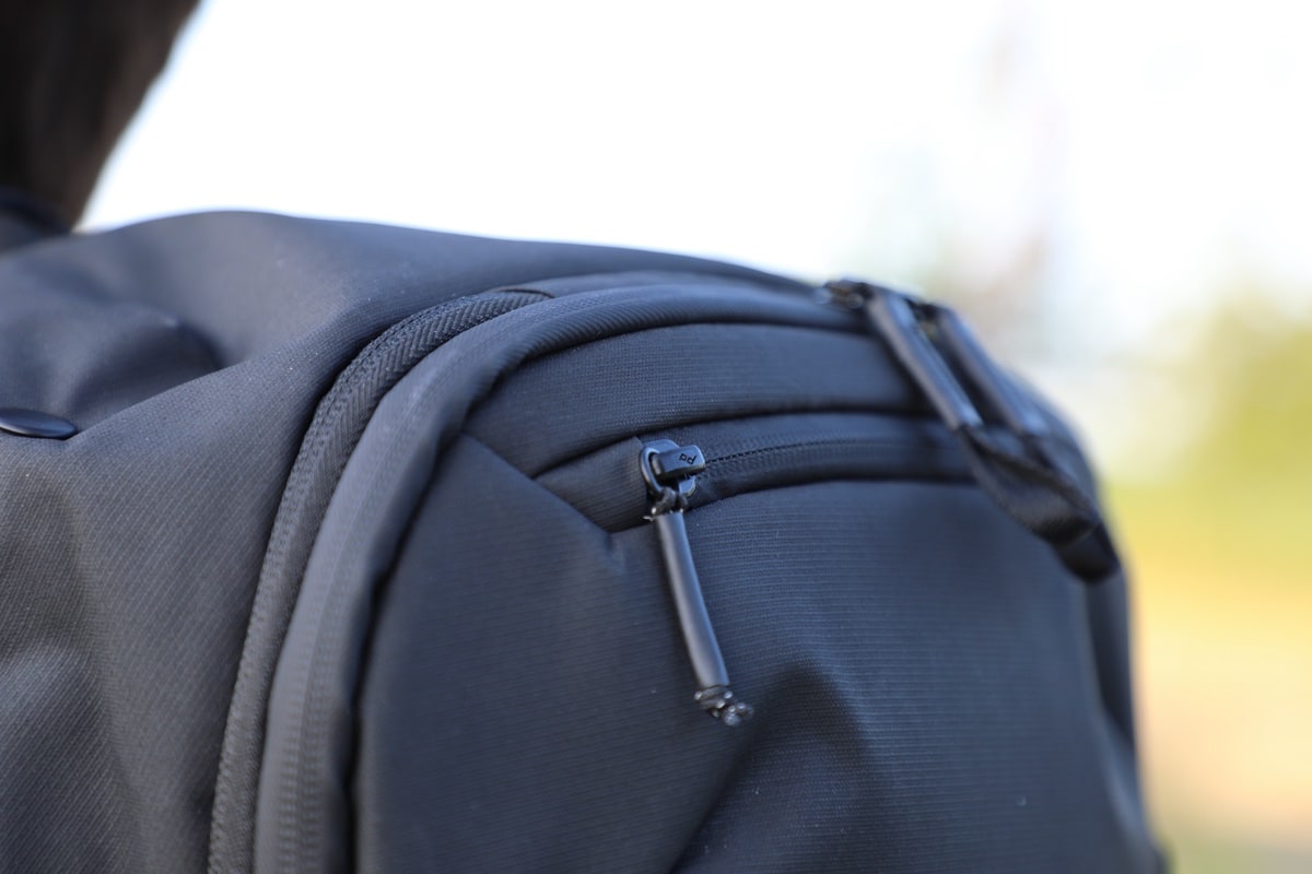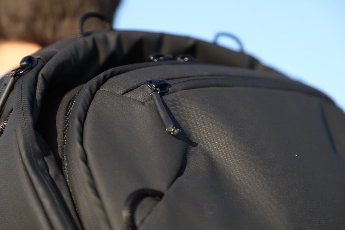 In Sachen Material setzt Peak Design, wie bei diversen anderen Modellen aus dem eigenen Portfolio, auf 400D-Nylon Versa Shell. Das wirkt schon direkt beim Auspacken sehr hochwertig (und durchaus robust). Dem schwarzen Design und Material sieht man es aber flott mit weißen Fleckchen an, wenn man wo entlanggeschliffen ist. Man setzt, wie bei den Everyday Backpacks, bei den Reißverschlüssen auf die sogenannten Ultrazips. Die Zähne verlaufen hier geschützt im Inneren, was den Rucksack auch wind- und wetterfest macht. Gerade bei den Reißverschlüssen sparen doch diverse Hersteller – hier ist das anders. Das Öffnen und Schließen funktioniert sehr flüssig und da kommt auch nichts ins Verhaken.