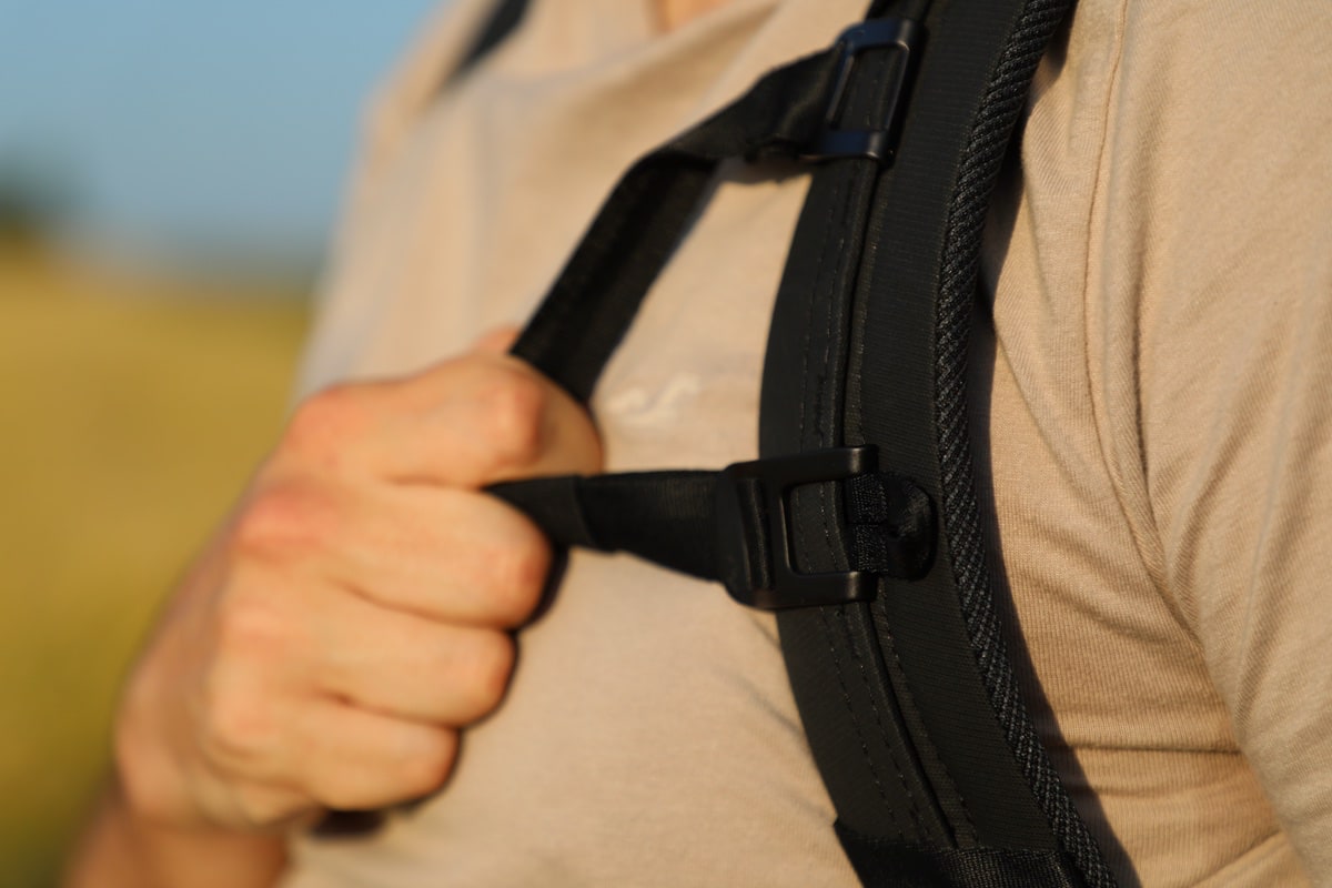 Der Rucksack lässt sich durchaus angenehm auf den Rücken schnallen. Die Abmaße des 45-Liter-Modells sind nicht gerade gleich. Ich habe aber, als etwas kleinere Person, das Gefühl, dass dieser sich auf meinem Rücken nicht überdimensioniert anfühlt, sondern hier lediglich das maximale ausschöpft, was ich mir da so dimensionstechnisch auf den Rücken schnallen sollte. Sollte es mal etwas schwerer werden, so hat man elegant hinter das Rückenteil einen flachen Hüftgurt sowie einen für die Brust verstaut. Während die meisten Hersteller hier auf günstige Plastiklösungen setzen, gibt es hier eine Lösung aus Metall: Die ist flach sowie hochwertig.
