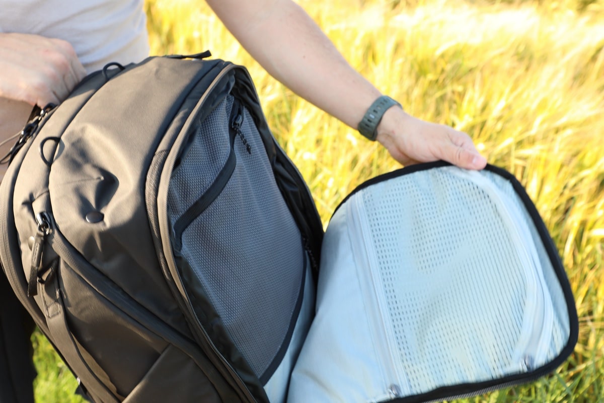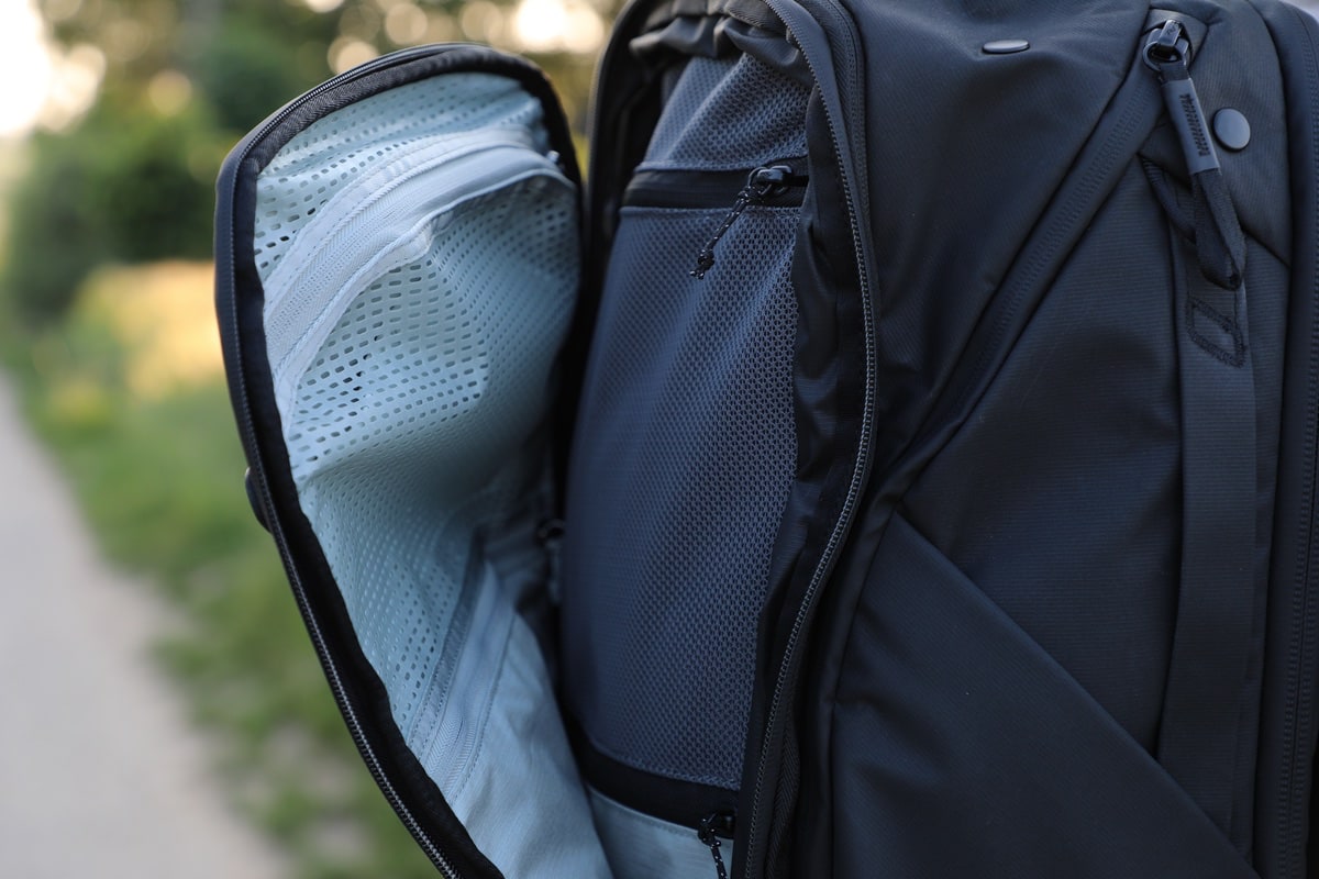 Auch in den übrigen Rucksackteilen gibt es durchdachte Fächer. So kommen nicht die beliebten, günstigen Netze zum Einsatz. Ein dediziertes Fach, welches als Kulturbeutel dienen kann, ist jedoch materialtechnisch (leicht zu reinigen) und auch durch die Lochstruktur darauf ausgelegt, dass hier auch eine feuchte Zahnbürste oder Ähnliches ihren Platz finden kann, ohne dass es direkt „muffelig“ wird. Was an vielen Rucksäcken der Fall ist: Die Seitentaschen für Flaschen sind schlichtweg sehr klein. Hier kann man durchaus die eine oder andere Liter-Flasche (je nach Design) unterbringen.
