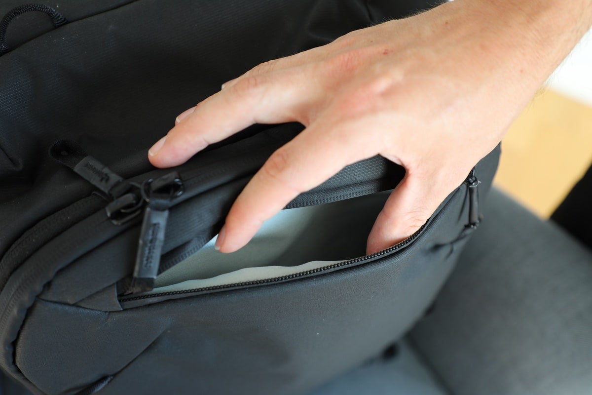 Ans Rückenteil anliegend ist ein Laptop- sowie Tablet-Fach. Auch wenn Peak Design sonst eher weniger auf Klettverschlüsse setzt, hier kommt einer zum Einsatz. Laptops bis 16 Zoll (ca. 41 cm) finden hier problemlos ihren Platz. Schade allerdings, dass das Fach nicht in der Höhe anpassbar ist, wie beim Everydack Backpack. Sprich das Laptop rutscht im Fach wirklich bis nach unten – was beim MacBook Pro 14 Zoll ein gutes Stück ist. Zudem kommt man an das Fach von außen nicht ran, sondern man muss den „Deckel“ des Rucksacks wirklich komplett öffnen und das geht nur, wenn man den Rucksack ordentlich auf einem Untergrund ablegen kann.