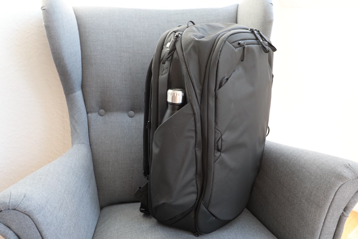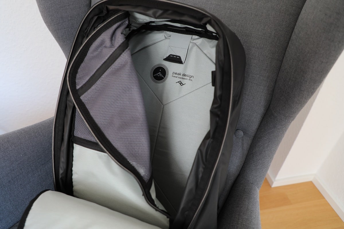 Eine Sache, die für mich durchaus einen Unterschied macht, aber sicherlich oftmals verkannt wird: Im beladenen Zustand bleibt der Rucksack aufrecht stehen. Ihr müsst diesen also nirgendwo anlehnen oder ihn zwangsläufig flach auf den Boden legen bzw. nur darauf warten, dass er von sich aus kippt. Das passt beim Peak Travel Backpack (und im Übrigen auch beim Everyday) optimal.
