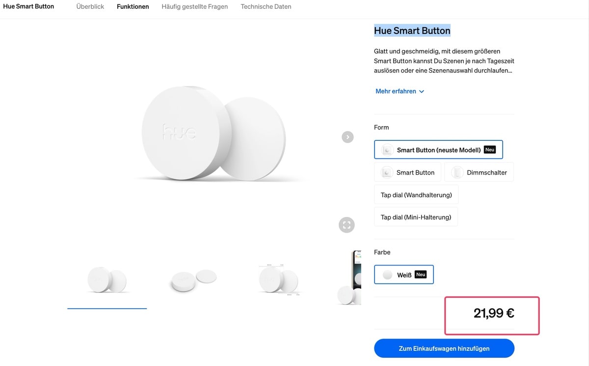 Im Hue-Ökosystem lässt sich der Taster vielseitig einsetzen. Neben der klassischen Ein/Aus-Funktion können Nutzer durch verschiedene Lichtszenen wechseln. Über einen langen Tastendruck ist zudem eine Dimmfunktion verfügbar – allerdings nur innerhalb der Hue-App. Bei der Apple-Home-Integration beschränkt sich die Funktionalität auf einen einfachen Tastendruck. Zur Montage liegt dem Smart Button eine magnetische Halterung bei. Diese haftet nicht nur selbst an metallischen Oberflächen, sondern verfügt zusätzlich über eine Kleberückseite für nicht-magnetische Untergründe. Aktuell ist das neue Modell für 21,99 Euro gelistet.