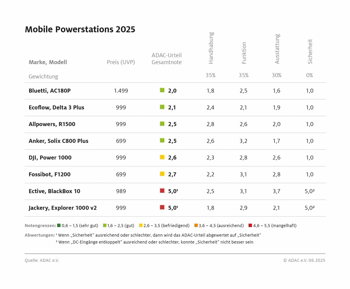 Bedenklich sind die Testergebnisse bei der Ective BlackBox 10 und der Jackery Explorer 1000 v2. Beide Geräte fallen mit der Note 5,0 durch und weisen Sicherheitsmängel auf. Das parallele Laden über Pkw und Solarpanel kann zu gefährlichen Überspannungen führen und das Fahrzeug beschädigen. Genauer geht der ADAC aber nicht auf das Thema ein. Weder an den Geräten selbst noch in den Bedienungsanleitungen finden sich Warnhinweise zu dieser Problematik.