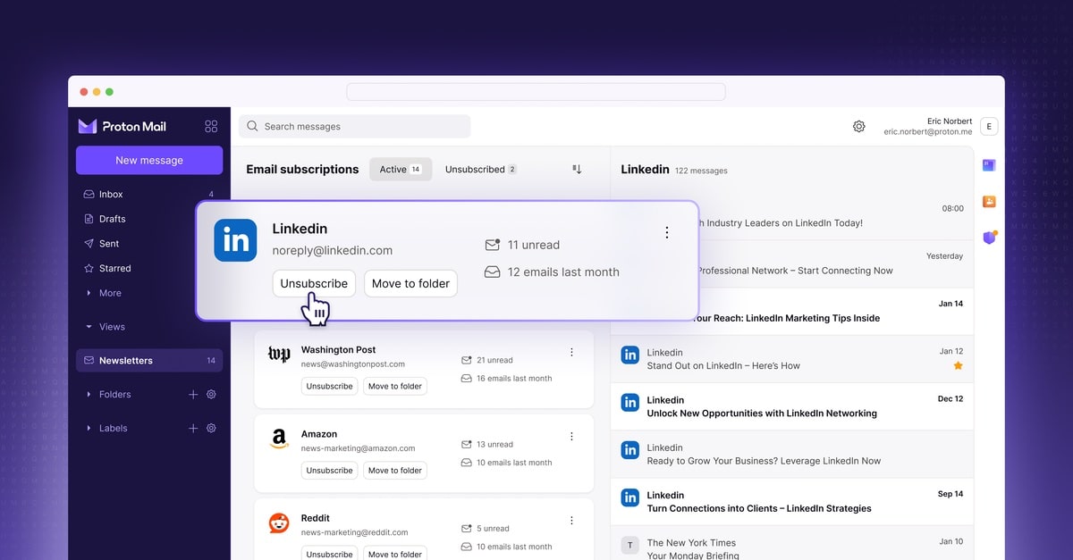 Proton Mail hat eine neue Newsletter-Ansicht vorgestellt. Diese soll das Navigieren im Posteingang erleichtern und den täglichen Strom der Mail-Flut von Newslettern bis hin zu Marketing-Kampagnen besser Herr zu werden.