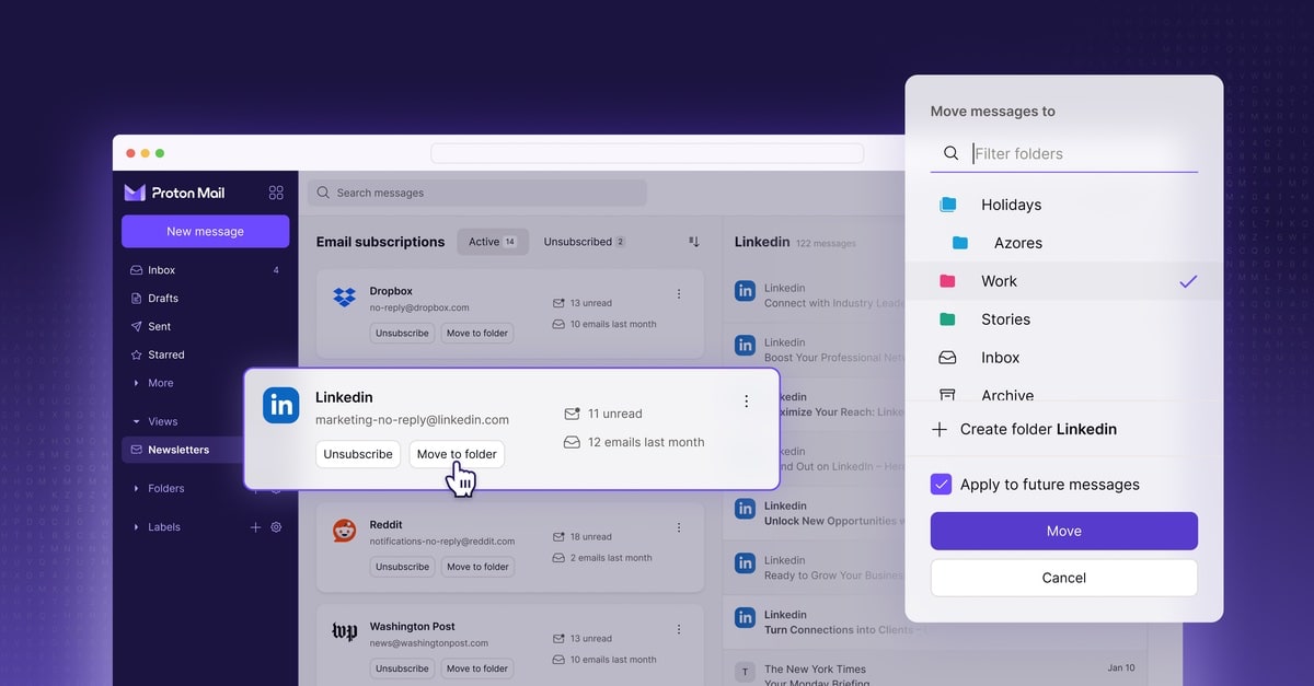 Zudem ist es möglich, Abonnements in einen eigenen Ordner zu verfrachten. So kann man auch später noch auf Rabatte, Updates oder Angebote zugreifen und diese nach eigenen Regeln prüfen. Proton Mail empfiehlt zudem, sich auf Plattformen mit E-Mail-Aliasen anzumelden, um eine weitere Schutzschicht zu schaffen und die echte Mail-Adresse zu schützen.