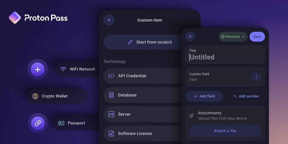 Ab sofort lassen sich in Proton Pass 14 neue Informationstypen ablegen. Darunter: medizinische Unterlagen sowie Führerscheine. Die Felder sind komplett anpassbar. Im digitalen Daten-Tresor können zudem Dateien mit einer Größe von bis zu 10 GB hinzugefügt werden. Als Beispiele für verschlüsselt abgelegte und sensible nennt Proton medizinische Daten und Kontaktdetails von Notfallkontakten, Bitcoin-Wallets, Reisepass-Details, WiFi-Zugänge oder auch SSH-Keys.