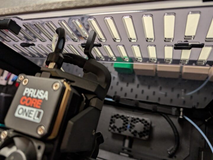 Beim Core One L lässt sich der seitliche Filamentsensor per Hebel mechanisch „deaktivieren“ bzw. der Pfad für TPU-Filamente freimachen. Das funktioniert super – bis das Filament dann oben am Extruder ankommt. Da sitzt nämlich noch ein Sensor, und der kann bei sehr weichem Gummi trotzdem zicken. Da hilft dann oft nur: Bowden-Schlauch ab und manuell nachschieben. So bleibt aber zumindest nur einmal „Ärger“, wenngleich es natürlich schon gewesen wäre, wenn sich entsprechend weiches Material nun endlich komplett unproblematisch bis in den Extruder einführen ließe.