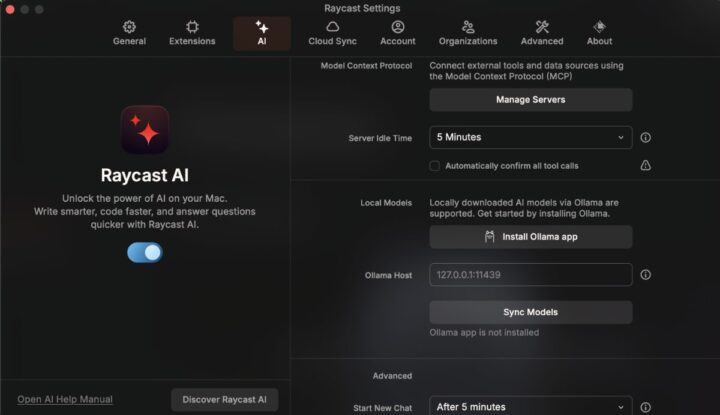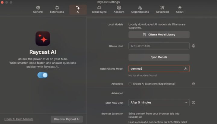 Danach könnt ihr über die Einstellungen -> AI Ollama herunterladen und installieren. Geht natürlich auch über die Ollama-Website. Raycast erkennt dann automatisch, ob ihr Ollama auf dem Mac habt.