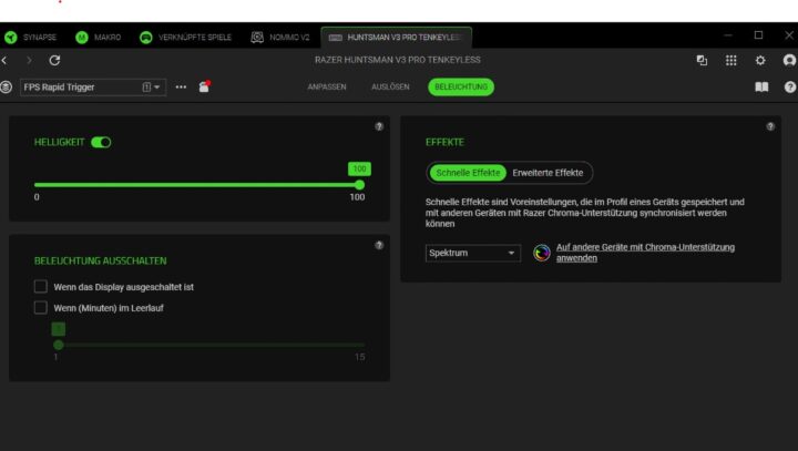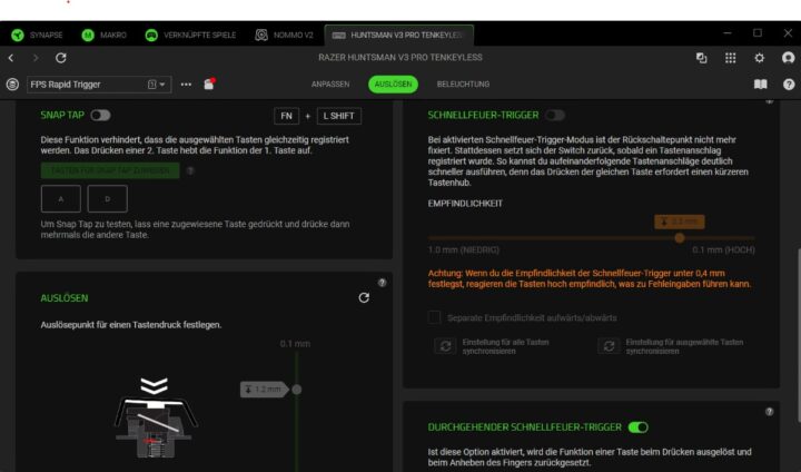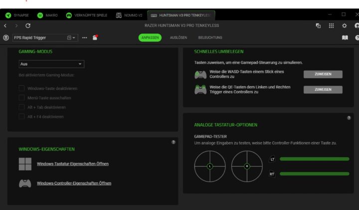 Die Razer Synapse Software ist wie immer mächtig, aber eben auch nicht immer intuitiv. Wer das volle Potenzial der Tastatur ausschöpfen will, kommt um die Installation nicht herum. Hier lassen sich Makros, Beleuchtung, Profile und natürlich die analogen Features bis ins Detail konfigurieren. Praktisch ist, dass viele Einstellungen auch direkt per Tastenkombination anpassbar sind – so bleibt man flexibel, auch ohne Software.