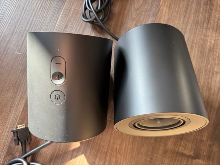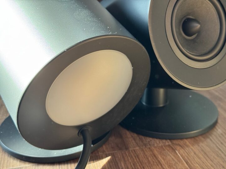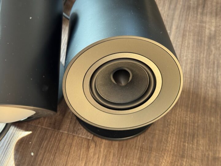 In puncto Design hat man sich bewusst schlicht gehalten. Die Zylinder stehen etwas angeschrägt auf ihrer Basis und können auch nicht im Winkel verstellt werden. Das hätte ich mir beispielsweise gewünscht. Klein sind die Dinger mit den Abmessungen von 130 mm (B) x 184 mm (H) x 180 mm (T) nicht, wirken aber sehr robust. Ich bin mir bis heute nicht sicher, ob die offene Membran eine gute Idee ist, vor allem wenn man Haustiere hat. Hier hätte ich zumindest gern optional erhältliche magnetische Gitter gesehen.