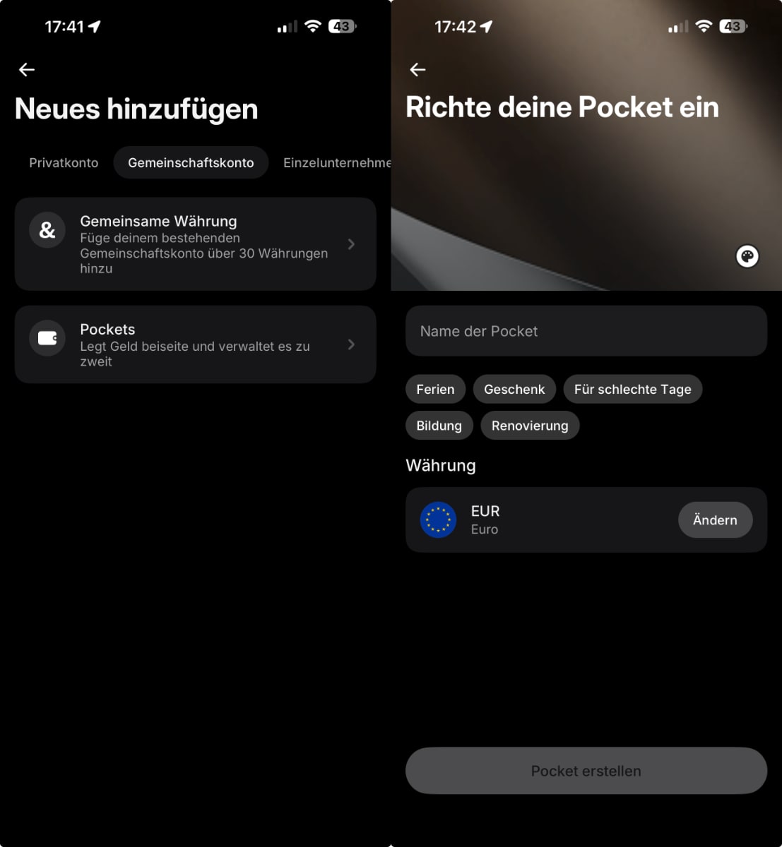 Diese können mit einem eigenen Namen versehen werden und auch einen personalisierten Hintergrund in der Revolut-App erhalten. Standen die Pockets bisher nur für Einzelkonten zur Verfügung, so stehen sie jetzt auch für Nutzer von Gemeinschaftskonten bei Revolut bereit.