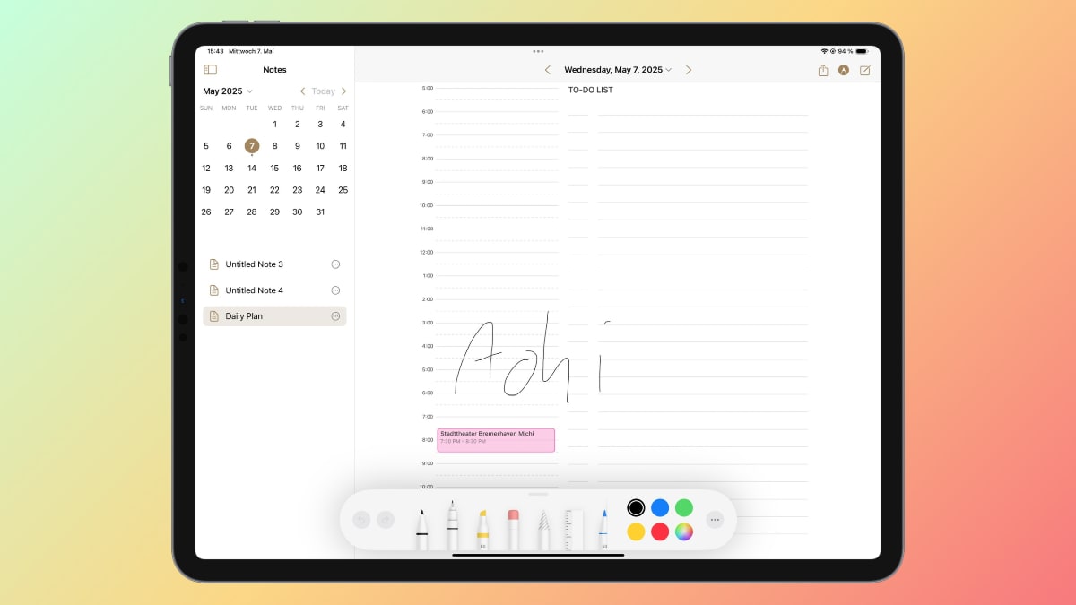 Die Besonderheit liegt in der Integration verschiedener Planungswerkzeuge auf einer einzigen Bildschirmfläche. Nutzer können mit dem Apple Pencil oder dem Finger (und nur so) direkt auf dem Display schreiben und zwischen verschiedenen Vorlagen wechseln – von klassischen Planerlayouts über Skizzenvorlagen bis hin zu Tagebuch- und Blankoformaten. Die Kalendersynchronisation ist dabei selbstverständlich.