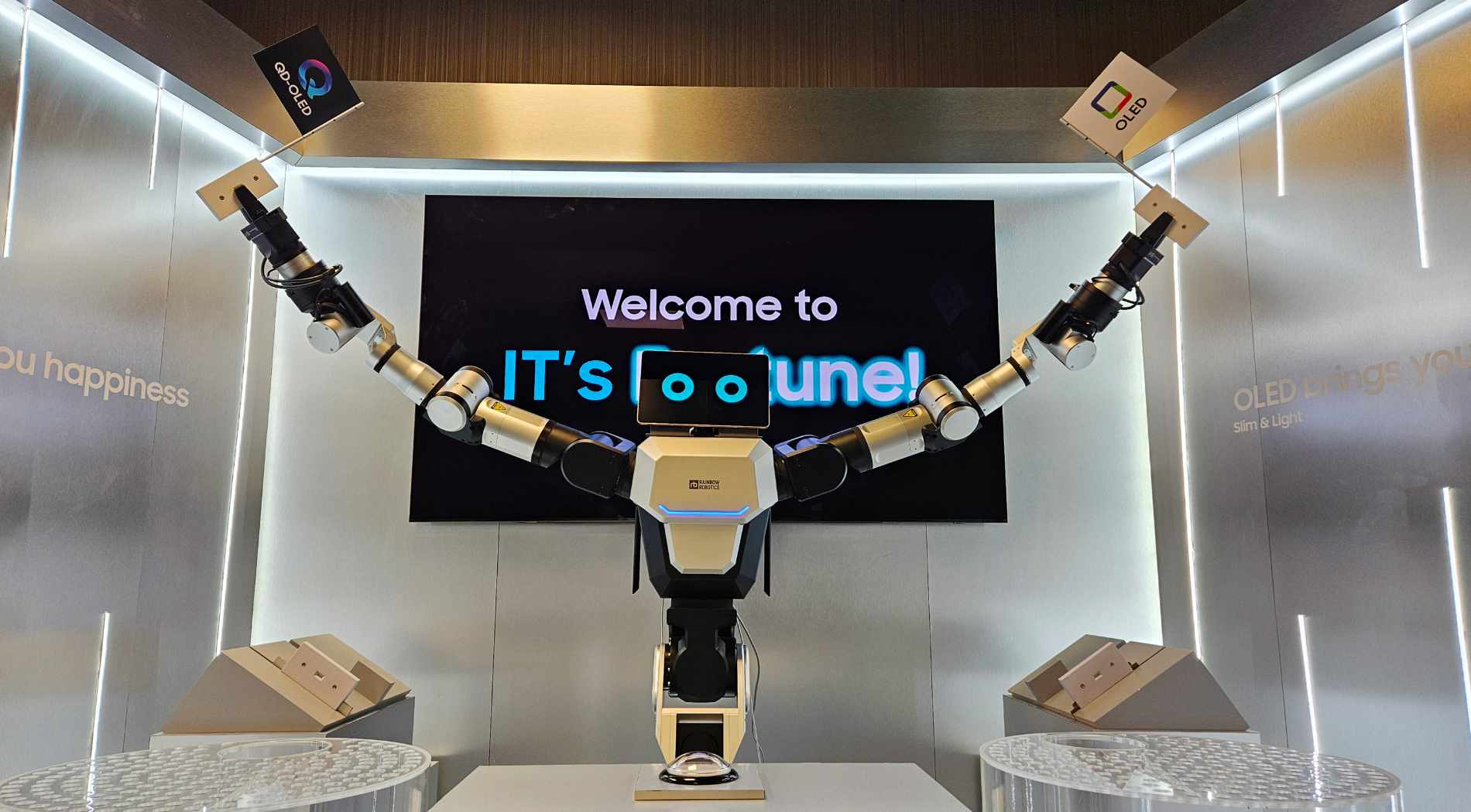 Im Übrigen macht sich Samsung Display auch noch einen Spaß daraus, in Kooperation mit Rainbow Robotics seine OLED-Panels ins rechte Licht zu rücken und im direkten Vergleich mit LCDs zu präsentieren. Bedenkt man, wie sehr der Mutterkonzern Samsung noch vor wenigen Jahren gegen OLEDs stichelte, dann hat es da mittlerweile einen gehörigen Paradigmenwechsel gegeben.