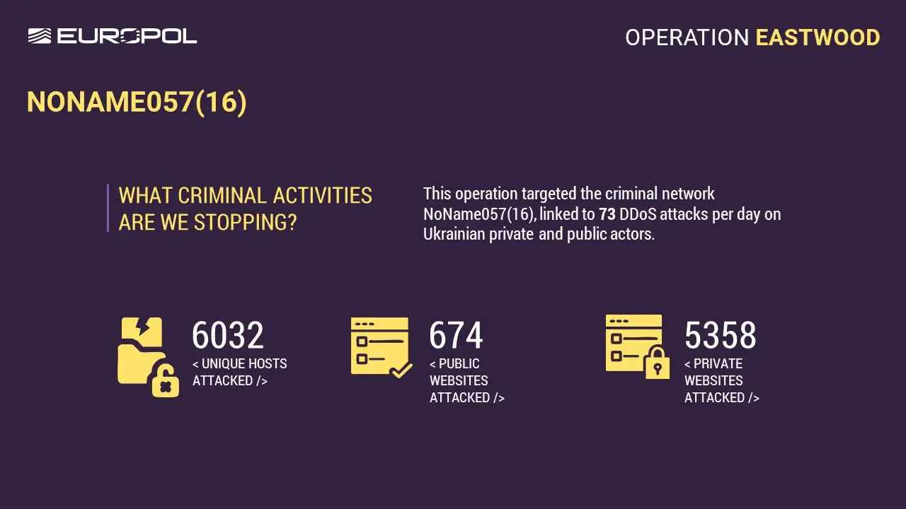 Laut offizieller Mitteilung gelangen im Zuge von Operation Eastwood zwei Festnahmen, die Ausstellung von insgesamt zehn Haftbefehlen, 24 Hausdurchsuchungen, 13 Zeugenbefragungen und die Kontaktierung von 1.000 Unterstützern der prorussischen, kriminellen Vereinigung. Zudem konnten über 100 Server weltweit im Betrieb gestört und wichtige Teile der Infrastruktur von NoName057(16) offline genommen werden.