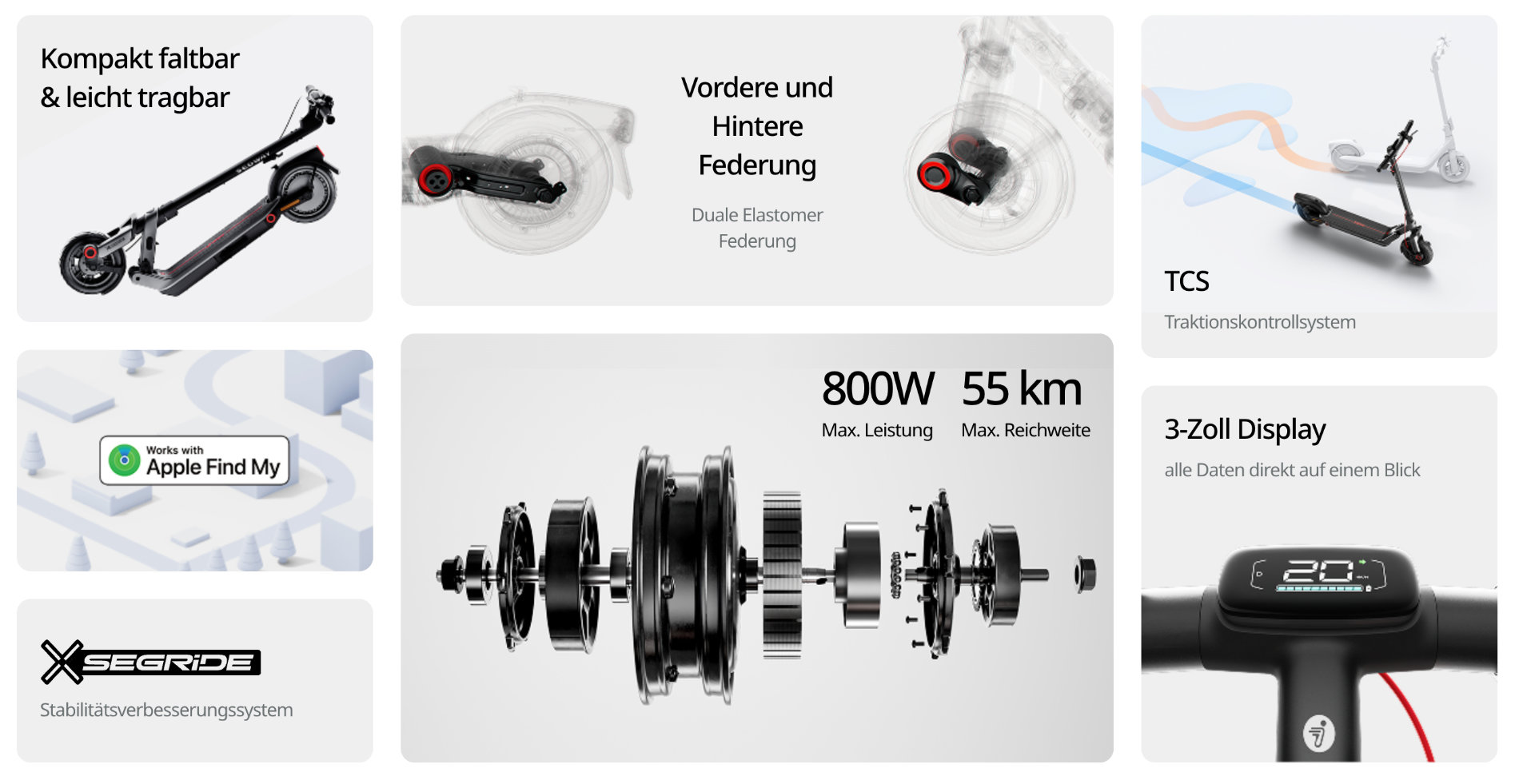 Für längere Fahrten kann ein optionaler 184-Wh-Akku nachgekauft werden. Zudem kann die E3-Serie dank Apple Find My geortet werden. Für die Gehäuse setzt Segway eine Magnesiumlegierung ein. Für den Transport lassen sich die Ninebot E3 und E3 Pro wiederum auch falten. Ihr Gewicht liegt bei jeweils 17,5 bzw. 17,9 kg. Der Fahrer darf hier maximal 100 kg wiegen.