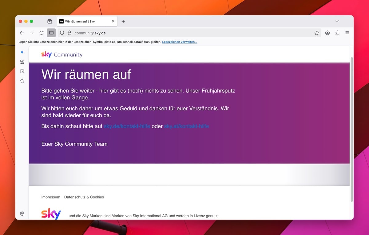 Seit Anfang des Monats haben uns zahlreiche E-Mails von Lesern erreicht. Seit längerer Zeit ist die Sky Community nicht erreichbar. Das ist vermutlich für zahlreiche Nutzer recht tragisch, tauschen sich doch dort viele Leute über alles rund um Sky, WOW und mehr aus. Laut Sky-Webseite handelt es sich um einen Frühjahrsputz, der aber nun schon recht lange vonstattengeht. Mittlerweile haben wir auch eine Information auf unsere Anfrage zum Thema bekommen. Es wird noch etwas dauern, bis alles wieder zurückkehrt, laut Sky zieht die Community um und wird in den „nächsten Wochen“ zurückkehren. Mal schauen, was alles neu ist…