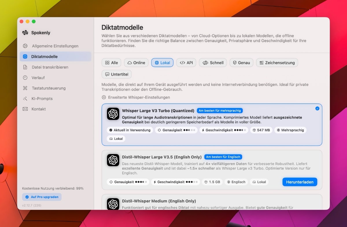 Aber: Nutzer können zwischen verschiedenen KI-Modellen wählen. Neben der Online-Version von Whisper stehen auch lokale Modelle zur Verfügung, die ohne Internetverbindung und vor allem auch kostenlos funktionieren. Die Wahl des Modells beeinflusst Geschwindigkeit, Genauigkeit und Speicherplatzbedarf.