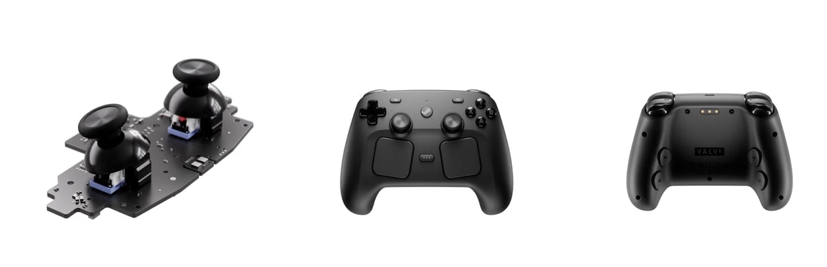 Die Analogsticks nutzen magnetische TMR-Technologie statt der üblichen Potentiometer. Valve verspricht dadurch bessere Empfindlichkeit und höhere Langlebigkeit. Die Sticks haben zudem kapazitive Sensoren, die Berührungen erkennen können. Das ermöglicht zusätzliche Eingabemöglichkeiten, die man über die Steam-Eingabe konfigurieren kann. Muss man mal sehen, andere Hersteller sind ja nun auch nicht unbedingt doof und Valve wird hier sicherlich nicht etwas völlig Neues erfunden haben.