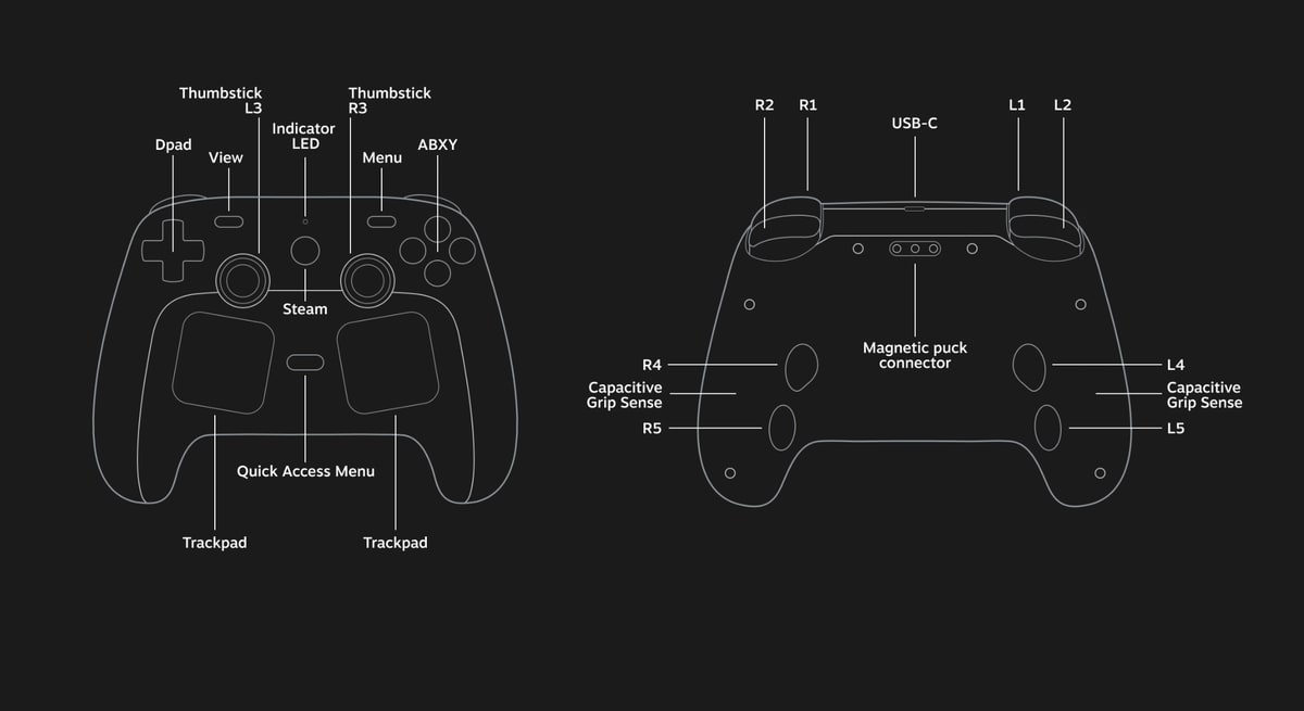 Die restliche Ausstattung entspricht dem Standard: ABXY-Tasten, Steuerkreuz, analoge Trigger, Schultertasten sowie vier zusätzliche Tasten auf der Rückseite. Dazu kommen die Steam-Taste für schnellen Zugriff auf die Bibliothek und das Schnellzugriffsmenü für Benachrichtigungen, Freundesliste und Chat.
