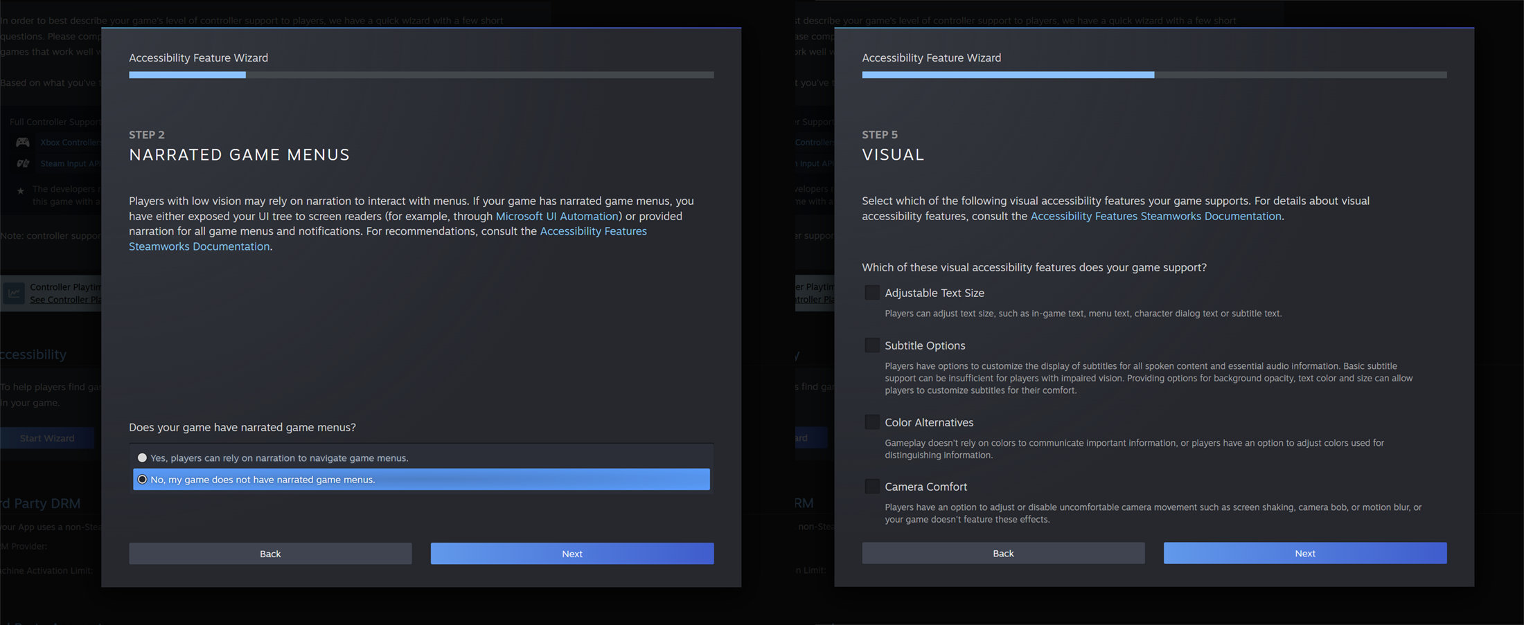 Da lassen sich dann z. B. Gameplay-Optionen wie ein anpassbarer Schwierigkeitsgrad, Audio-Optionen wie Menüs, deren Funktionen vorgelesen werden können, oder visuelle Einstellungsmöglichkeiten, etwa zu Textgrößen, hinterlegen. Auch zusätzliche Maßnahmen für mehr Barrierefreiheit, etwa Sprache-zu-Text- oder Text-zu-Sprache-Optionen, lassen sich vermerken.