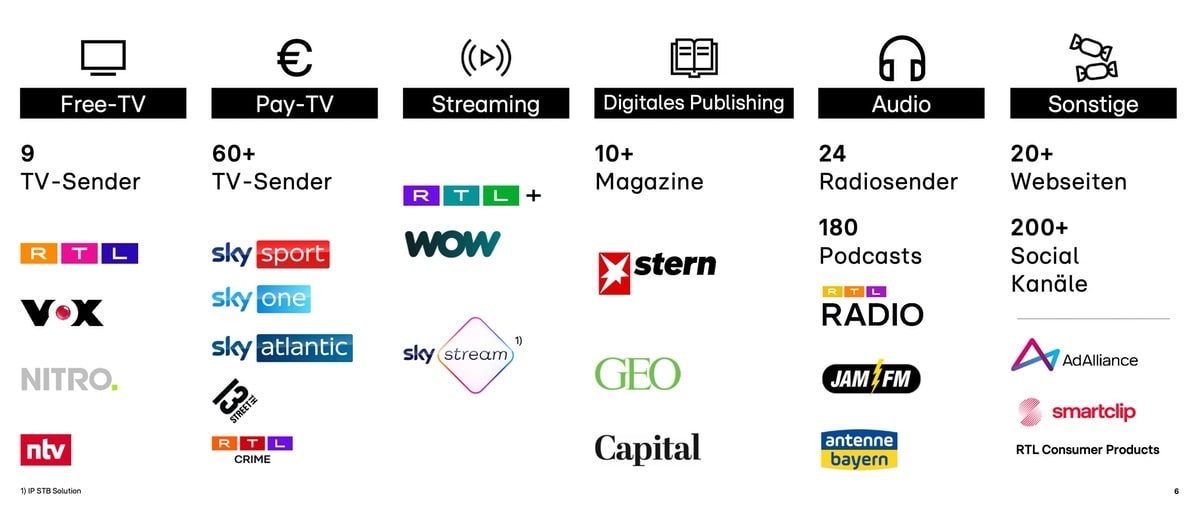 Sky bringt wichtige Sport-Rechte in die Ehe ein: Die Bundesliga, den DFB-Pokal, die Premier League, die Formel 1 und in Österreich die Champions League. RTL steuert Shows, Reality-Formate und Nachrichteninhalte bei. Die Führung des fusionierten Unternehmens übernimmt nach Abschluss der Transaktion der aktuelle RTL-Deutschland-Chef Stephan Schmitter. Die Unternehmenssitze bleiben in Köln (RTL) und München (Sky). Durch Synergien sollen jährlich 250 Millionen Euro eingespart werden. Der Zusammenschluss steht noch unter dem Vorbehalt der Zustimmung der Wettbewerbs- und Medienkonzentrationsbehörden. Mit einer Entscheidung wird 2026 gerechnet. Bis dahin arbeiten beide Unternehmen unabhängig voneinander weiter.
