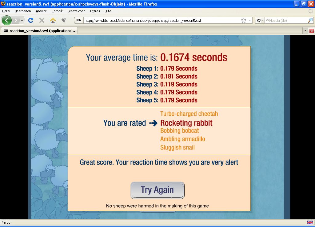 Ganz so schnell war ich leider nicht – vielleicht muss ich doch noch nen Espresso trinken;-) [0,22 Sekunden][1] war mein Bestes [1]: http://www.tipps-archiv.de/browsergame-spiel-online-schaf.html aber ich werd noch etwas üben …