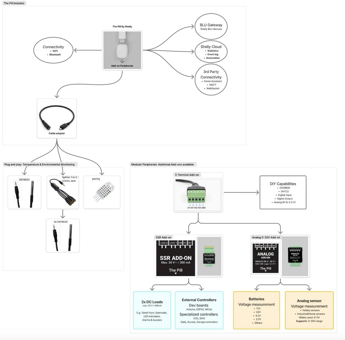 Es lassen sich bis zu zwei unabhängige DC-Lasten von bis zu 30 Volt / 300 mAh über ein externes Add-On (SSR-Modul) steuern, um Automatisierungen mit Niederspannungssteuerung einzubinden. Außerdem: Die Pill arbeitet als Bluetooth-Gateway und erlaubt BLU-Geräten der Shelly-Serie eine Anbindung.
